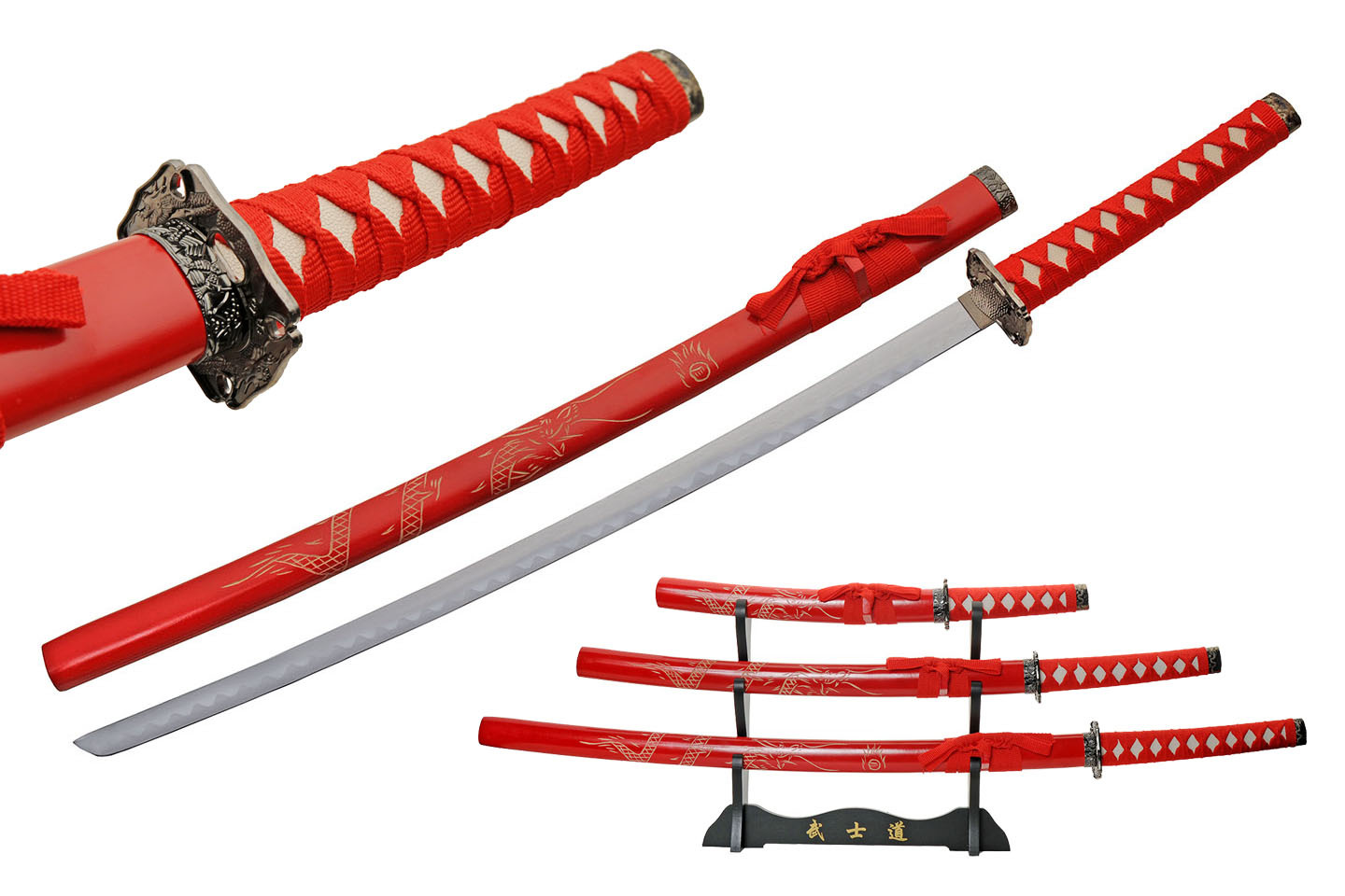 Add to Cart 3PC PINK DRAGON SAMURAI SET MSRP: Was: Now: $69.99 49.5", 31", 21.5" OVERALL LENGTHS CARVED DRAGON ON WOODEN SCABBARD METAL TSUBA NYLON WRAPPED HAND…
